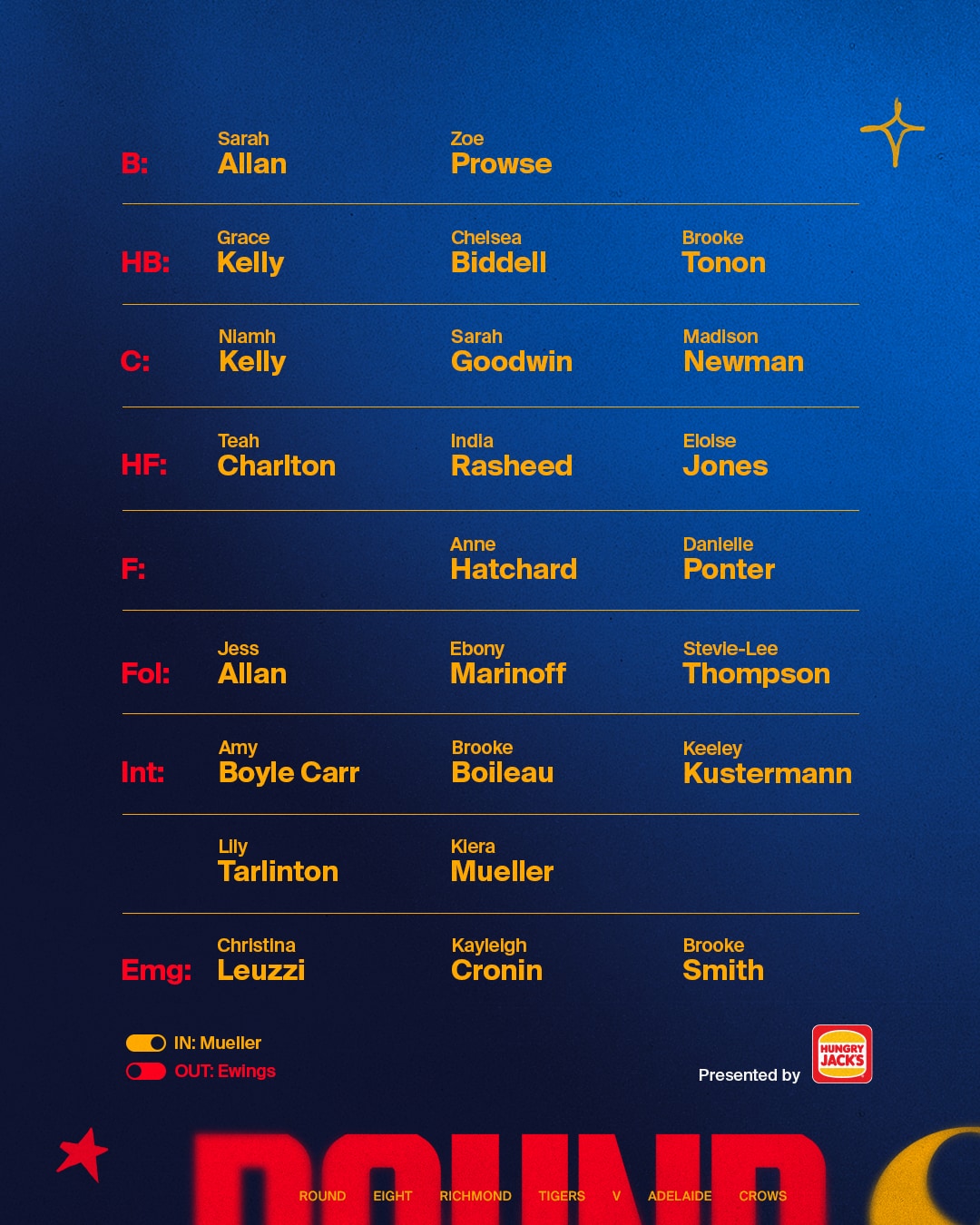 Utility Hannah Ewings comes out of the team for Mueller, after featuring in the Crows’ past two matches.
