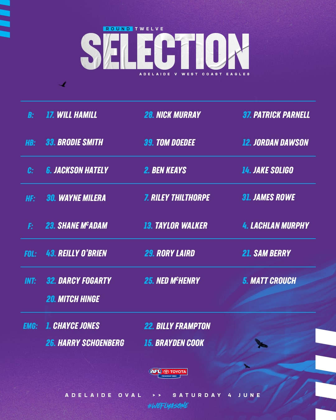 Adelaide has made two changes to its side set to face West Coast at Adelaide Oval on Saturday.