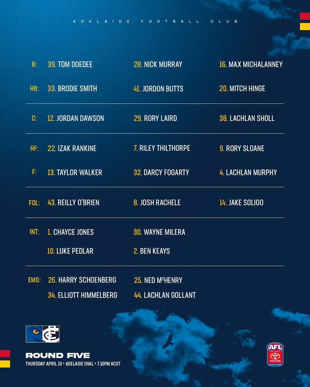Adelaide’s Round Five Team is: