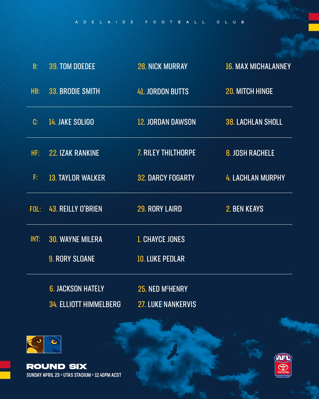 Adelaide will take an unchanged line-up into its Round Six match against Hawthorn in Tasmania on Sunday.