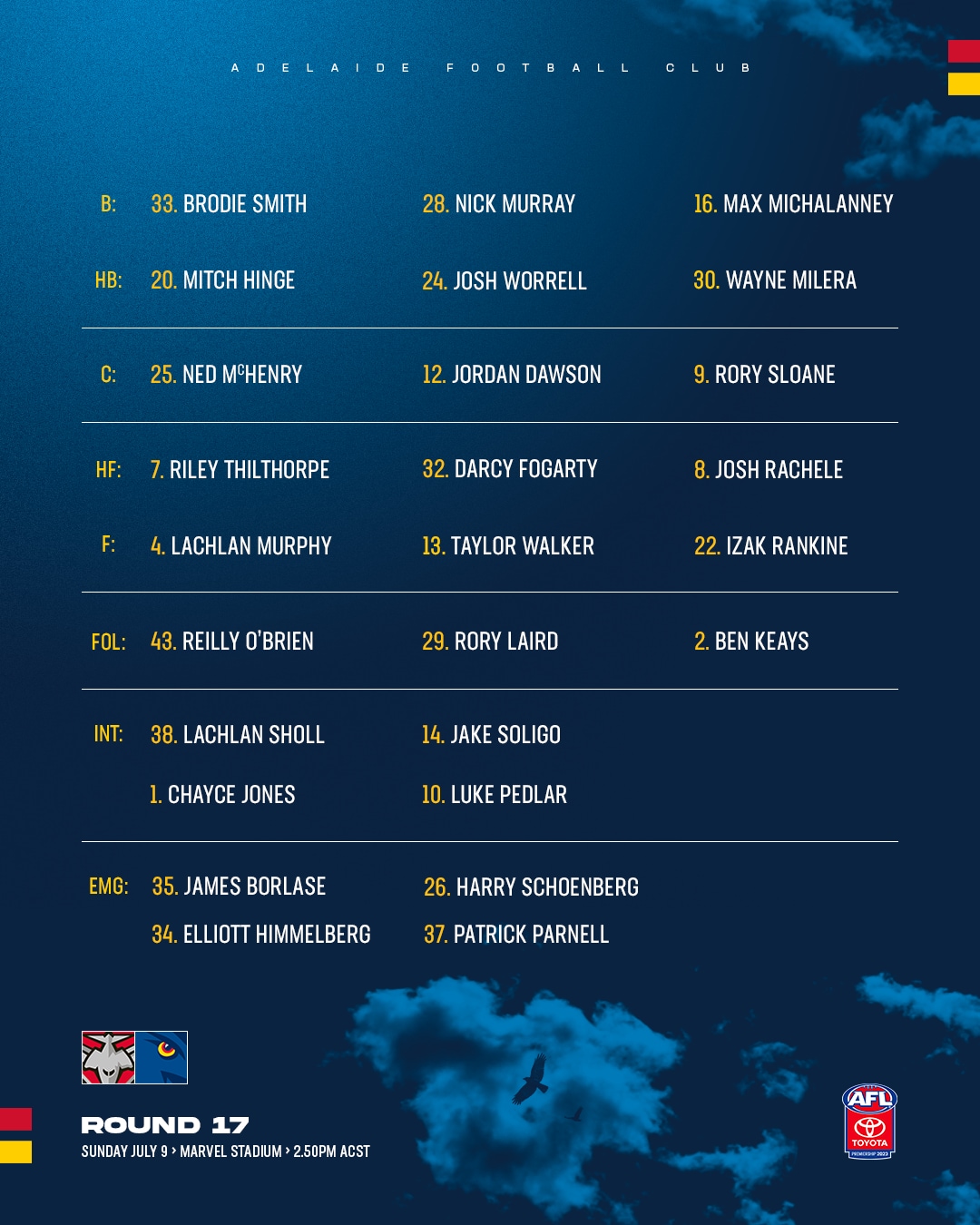 Adelaide has made one change for its Round 17 match against Essendon at Marvel Stadium.