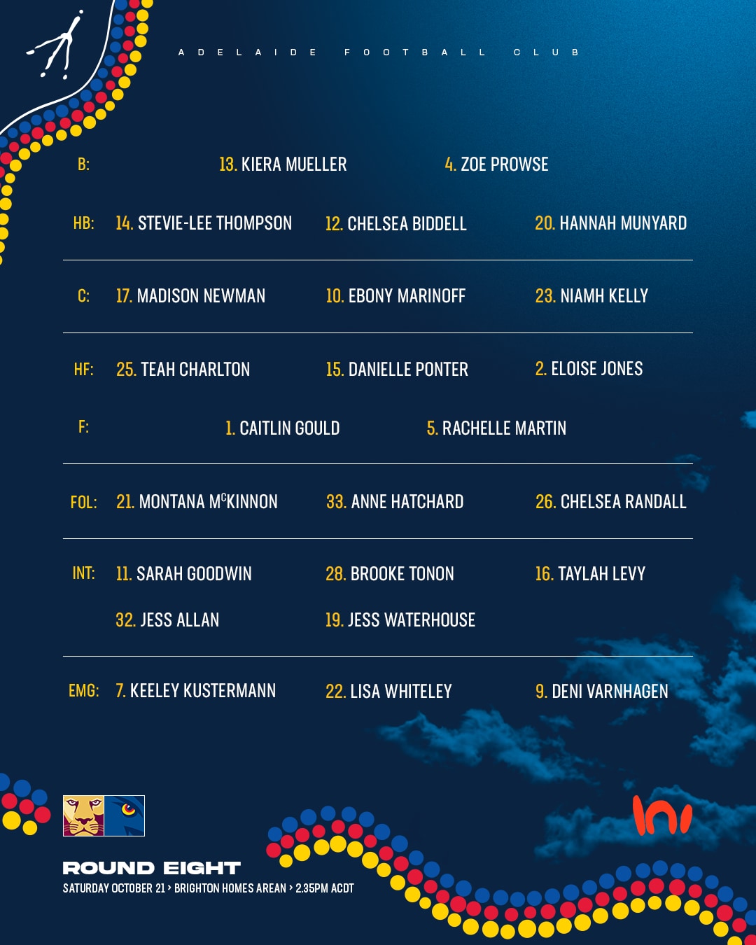 Utility Brooke Tonon also comes back into the side for her first game since the Round Five win against Gold Coast.