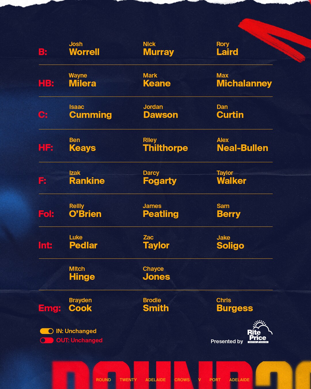 Adelaide has named an unchanged line-up for Showdown 58 against crosstown rival Port Adelaide at Adelaide Oval.