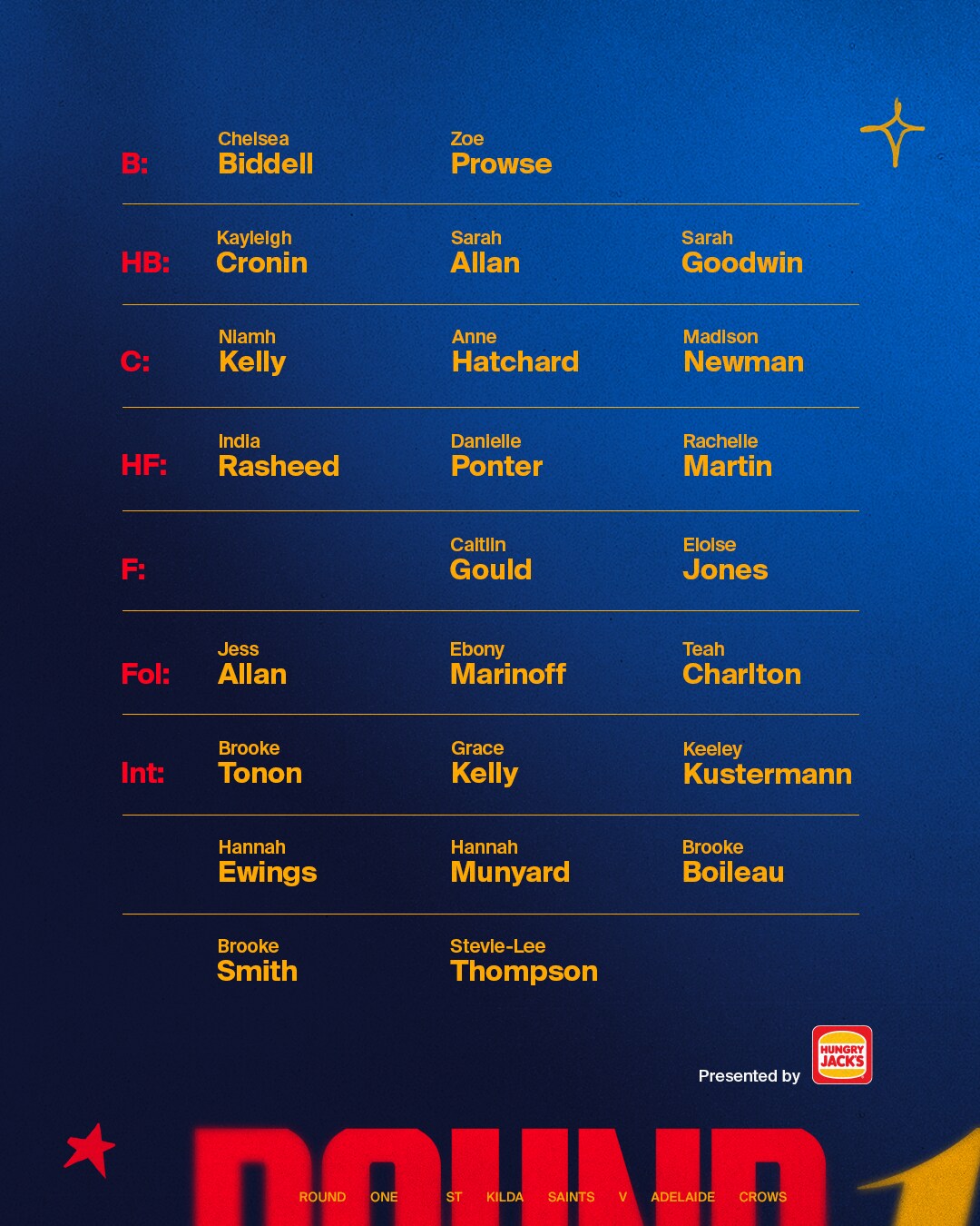 As announced on Thursday afternoon, a pair of AFLW debutants headline the extended squad, with first round draftee India Rasheed and Irish recruit Kayleigh Cronin set to play their first games.
