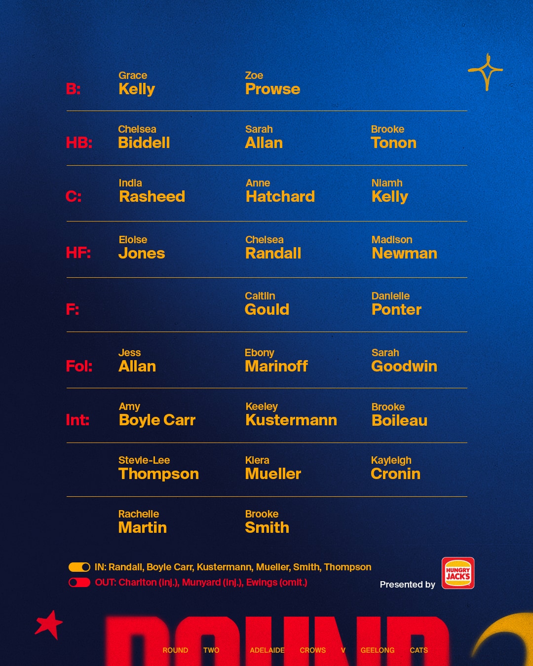 She is one of six inclusions to the Crows’ squad for their home opener against the Cats.