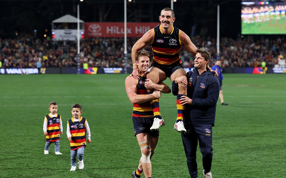 Walker’s late pass to Charlie Cameron is locked inside the club’s all-time highlights vault. The captain outpointed his opponent in a marking contest, took a long, two-bounce run down the wing and then cleverly passed the ball inside to Cameron, who goaled to give Adelaide a seven-point lead with 90 seconds to play. It was the last of a game-high 13 score involvements for Walker, who ten minutes earlier had kicked a 50-metre goal to reduce the margin to one point. “Tex’s last quarter was so huge,” Crows star Rory Sloane said post-game.