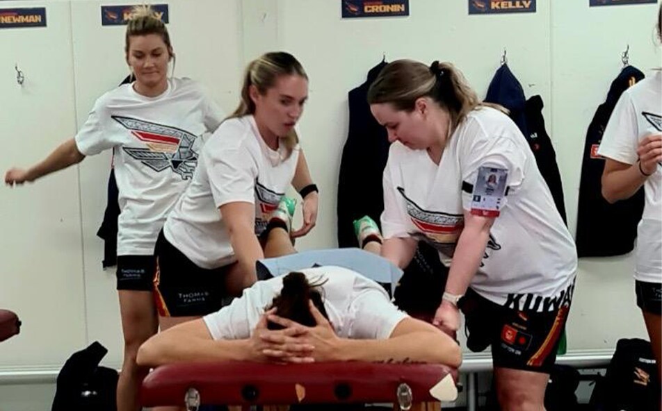 2.15pm – Team meeting time. Coach Matthew “Doc” Clarke gathers everyone to give his final thoughts on tactics. He also makes special mention of forward Danielle Ponter, who will be celebrating her 75th AFLW game against the Giants. Doc plays a highlights package of DP’s finest on-field moments. The team then splits into their lines (forwards, midfielders, defenders) for more specialised opposition analysis.