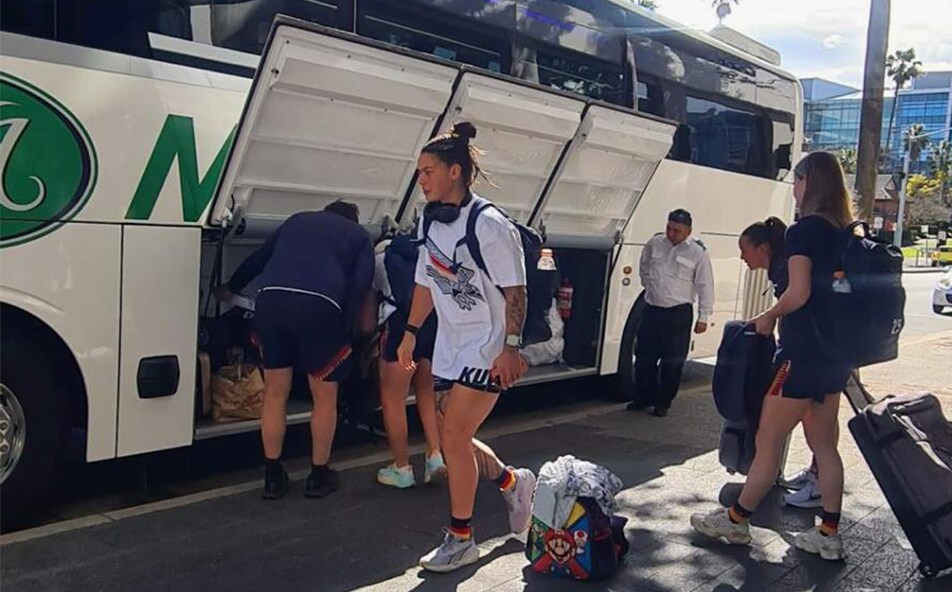 10.30am – The team checks out of the Pullman and loads their luggage onto the team bus. But there’s an issue: Ebony Marinoff – who always travels with her pillow – cannot find it. She is sure she left it near her luggage, but it’s disappeared. All she has is her pillowslip.