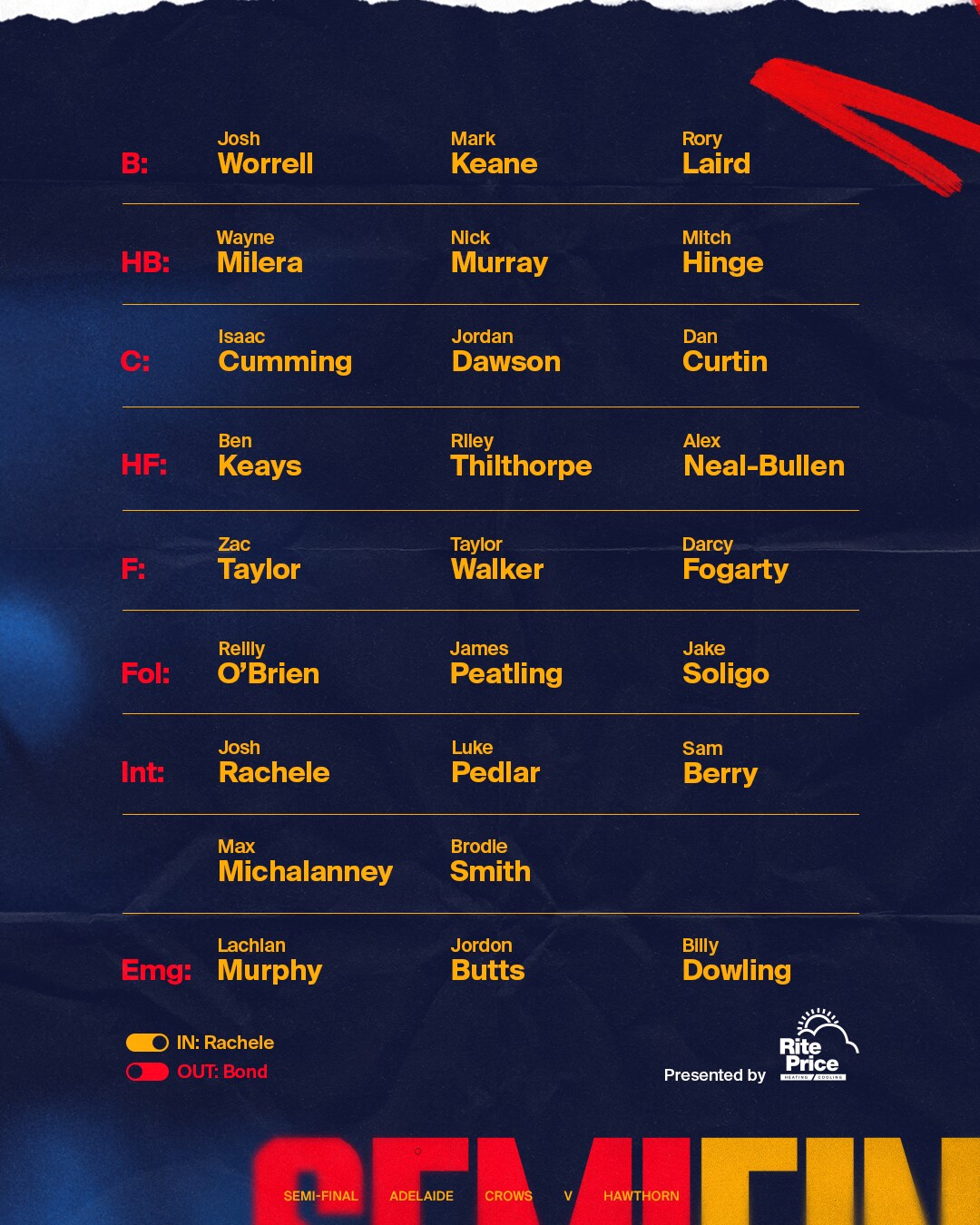 Adelaide has made one change ahead of its semi-final match against Hawthorn, naming livewire forward Josh Rachele for the do-or-die clash.