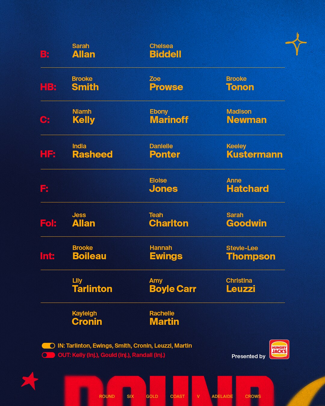 The Crows will have to make three changes for the trip to Queensland, with Grace Kelly (calf), Chelsea Randall (concussion) and Caitlin Gould (wrist) set to miss the clash due to injury.