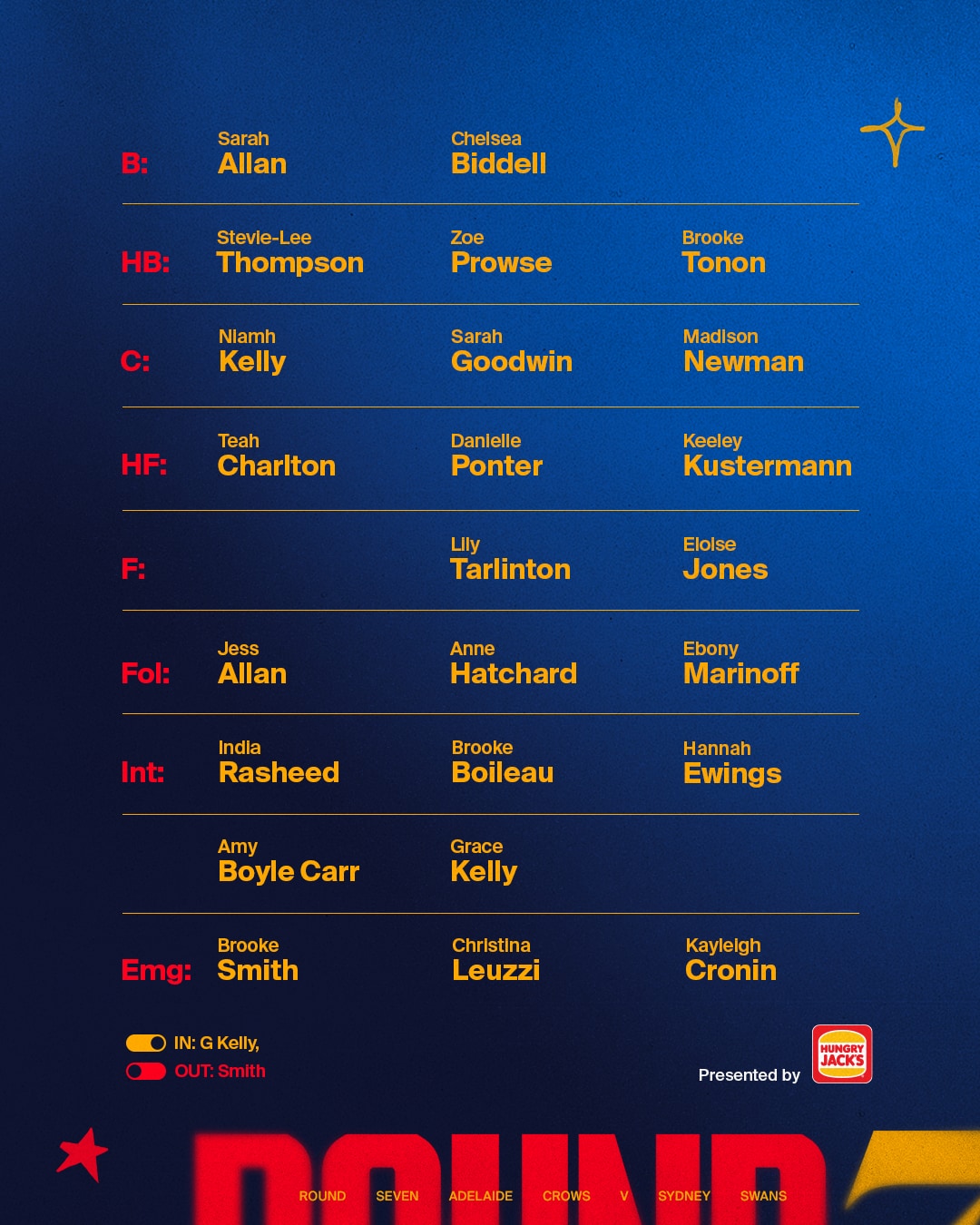 Adelaide Head of Women’s Football Phil Harper said Smith was unlucky to miss out, with Kelly earning her opportunity to come straight back in after an impressive start to the season.
