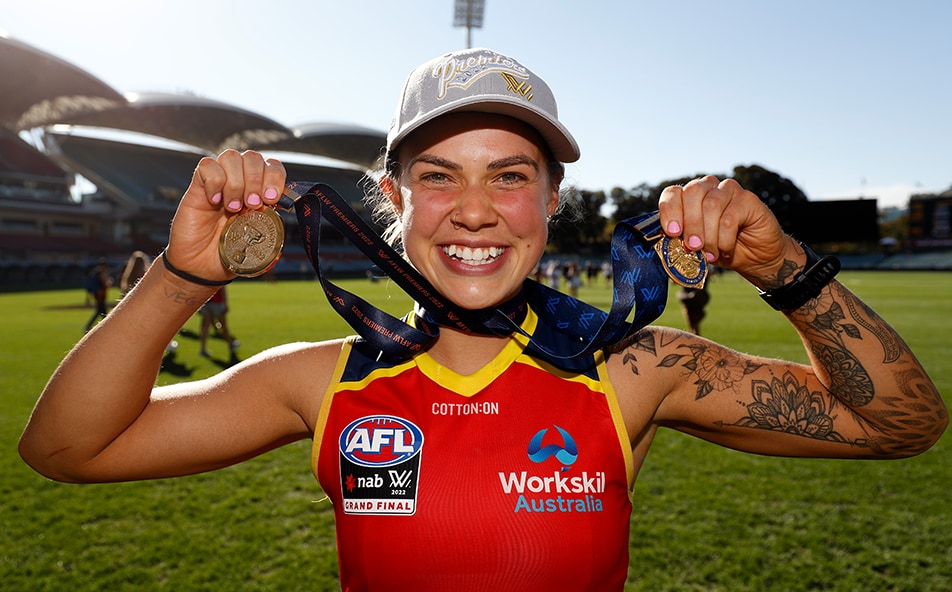 Hatchard has built a fine football resume across her 99 games to date, featuring in the Crows’ 2017, 2019 and Season Six (2022) flag wins, and taking out the best-a-field medal in the latter Grand Final triumph.