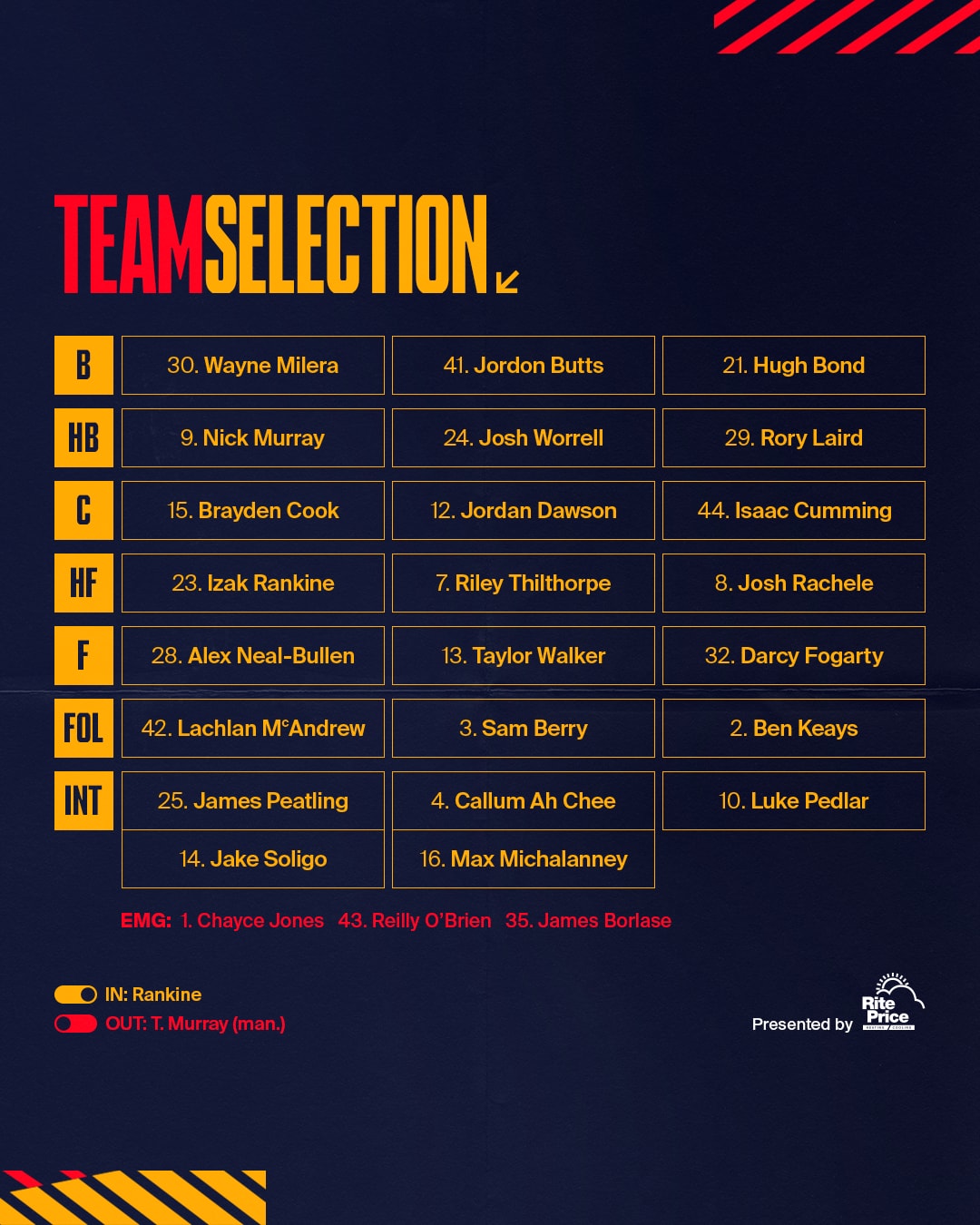 Chayce Jones, Reilly O’Brien and James Borlase have been named on the emergency list.