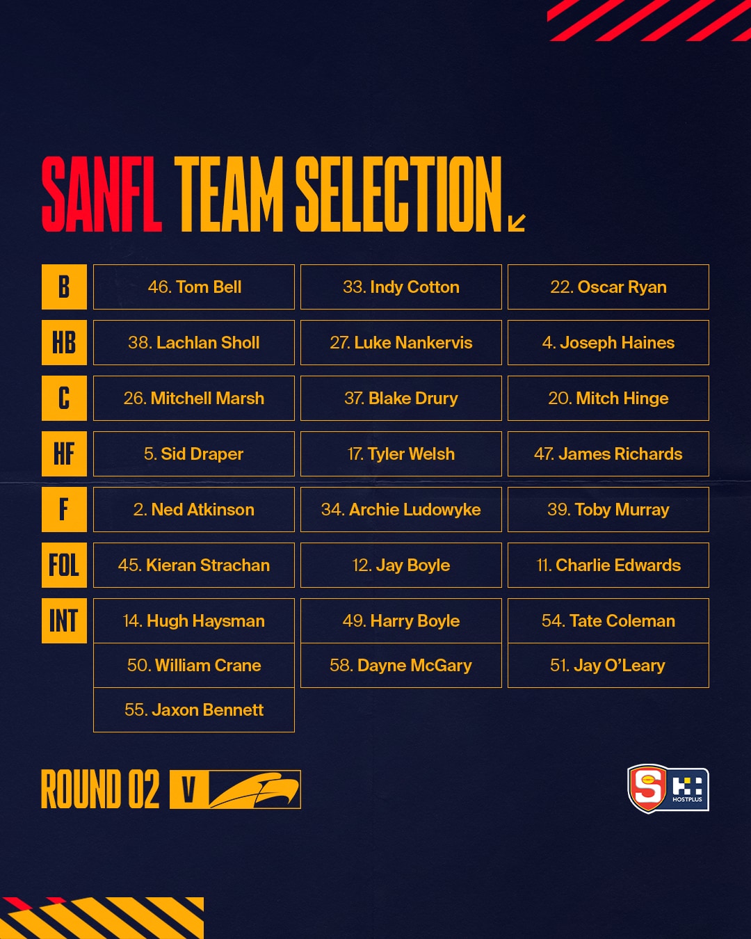SANFL-listed players included in the squad are Tom Bell, Joseph Haines, Blake Drury, James Richards, Ned Atkinson, Kieran Strachan, Jay Boyle, Hugh Haysman, Harry Boyle, Tate Coleman, Will Crane, Dayne McGary, Jay O’Leary and Jaxon Bennett.