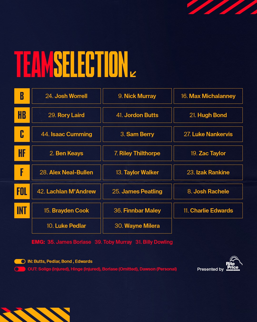 Defender Jordon Butts returns to the line-up alongside forward Luke Pedlar, with the pair having successfully cleared the AFL’s concussion protocols.