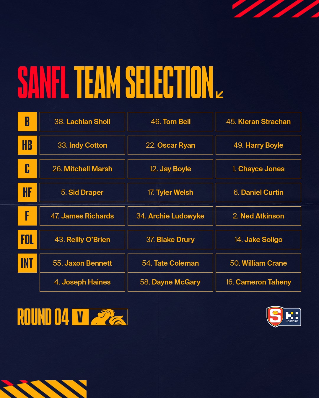 SANFL-listed players named in the squad include James Richards, Kieran Strachan, Blake Drury, Jay Boyle, Harry Boyle, Tom Bell, Ned Atkinson, Jaxon Bennett, Tate Coleman, Will Crane, Joseph Haines, Dayne McGary, and Cam Taheny.