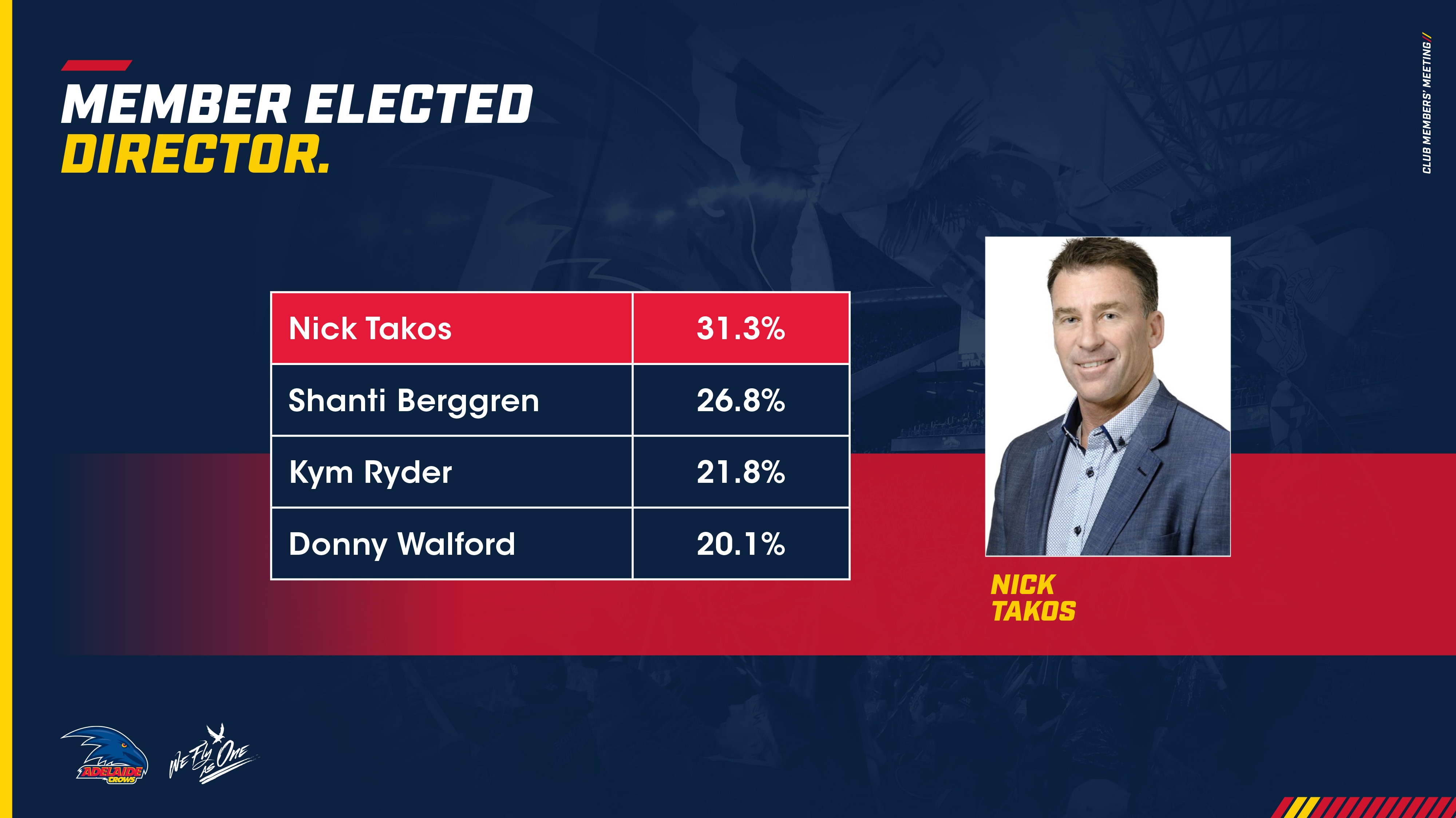 Experienced sports administrator Nick Takos has joined the Adelaide Football Club’s Board of Directors after claiming victory in an independently run election.